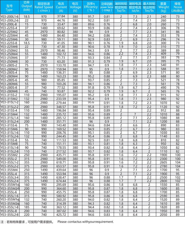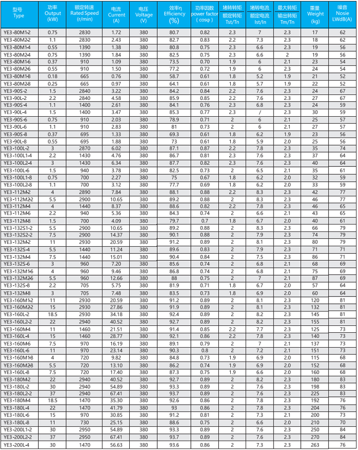 YE3系列(中心高H80-355mm、0.55-375kw)電動機是全封閉、自扇風冷式鼠籠型三相異步電動機,產品能效與EC60034-30的IE3保持一致。一般電壓為380V、頻率為50Hz也可按客戶要求定制。工作環境-15-40°C,海拔不超過1000M,絕緣等級F(B極考核)防護等級IP55、冷卻方式IC411、工作制S1、安裝方式符合IEC和DIN標準。