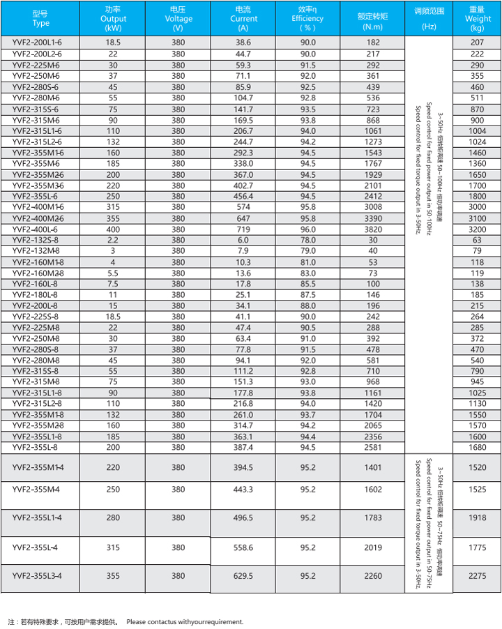 YVF2系列電機是可以采用變頻器供電的三相異步電動機,是電機節能的一種典型應用,采用特殊的絕緣系統吏其能適用于變頻器供電系統,一般額定電壓380V,頻率50Hz,5~50Hz為恒轉矩,50~100Hz為恒功率,也可根據用戶要求確定額定點的電壓和頻率,防護等級IP55、冷卻方式IC416、安裝方式符合IEC和DIN標準。